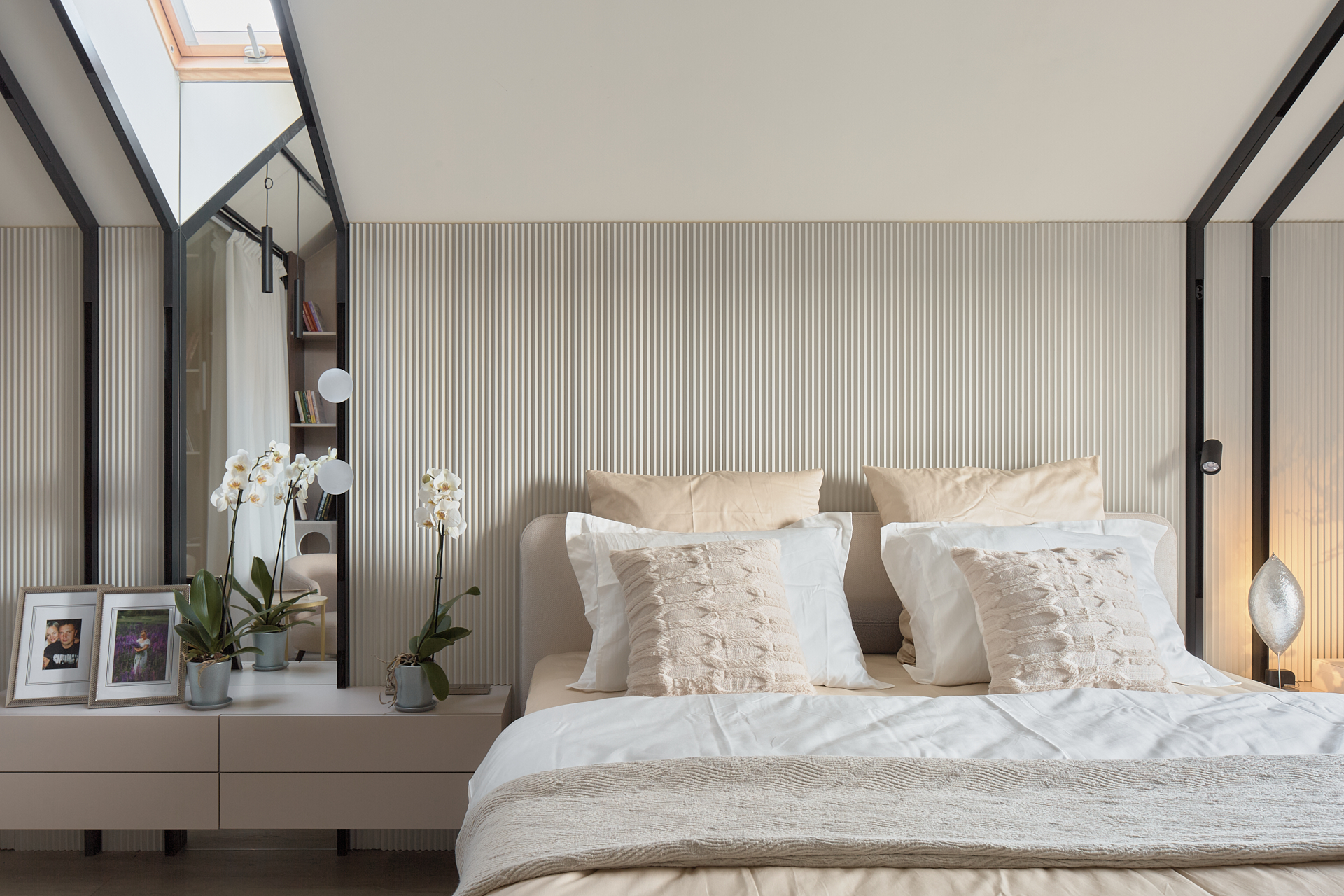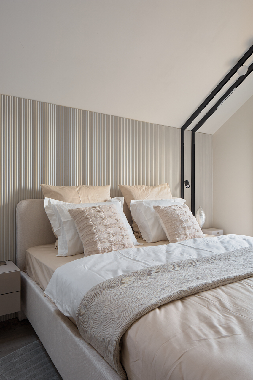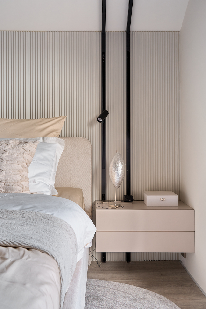 В подобных проектах особенно важна работа не только с цветом и освещением, но и с геометрией декоративных элементов. Одной из главных задач дизайнера было поднятие потолка, и это было решено при помощи рельефной стены за кроватью с вертикальными линиями, которая стала ярким визуальным акцентном во всем интерьере.