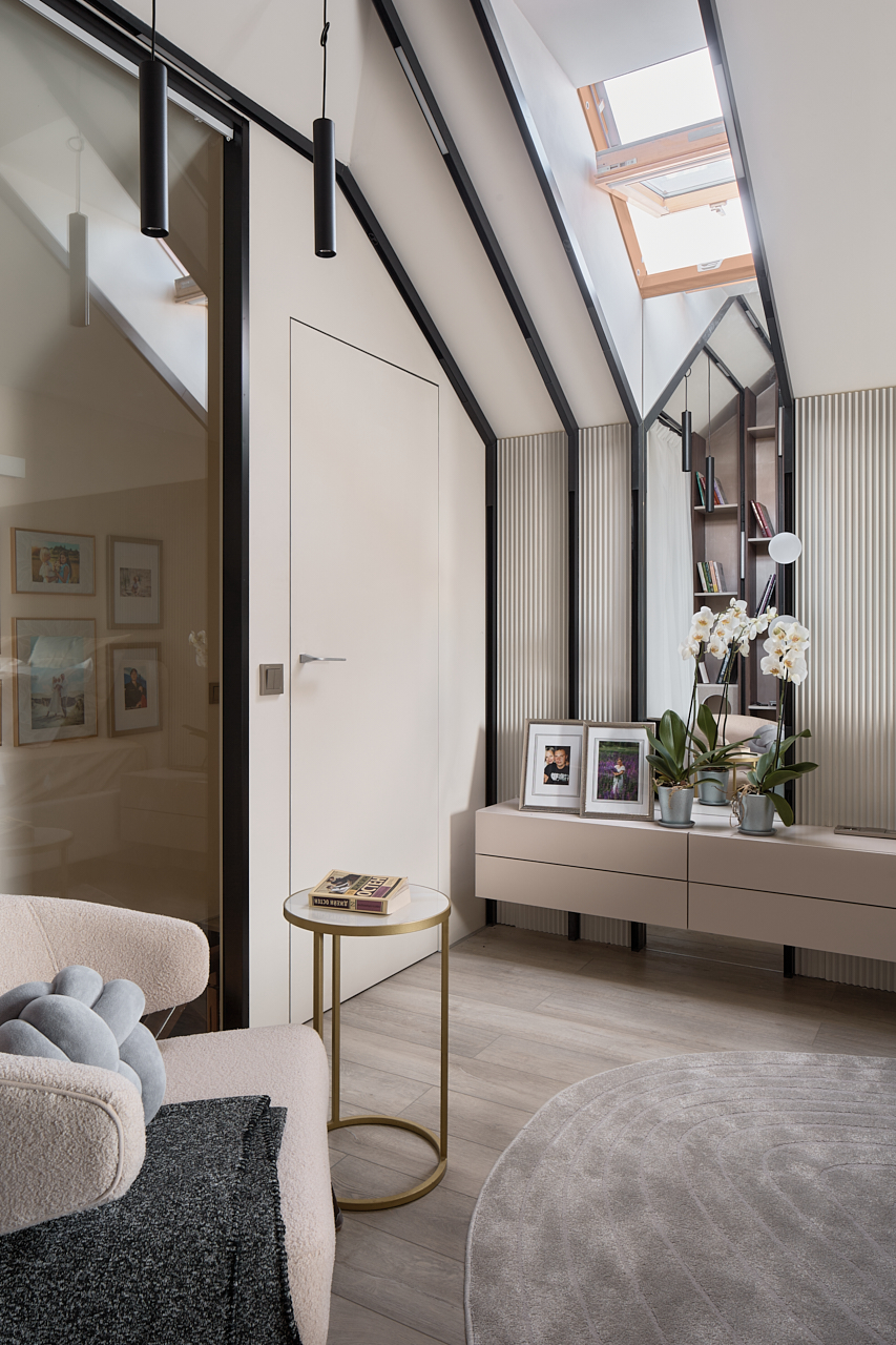 Эффект вертикальных линий стеновых панелей был усилен при помощи контрастных черных реек, которые создают контурные акценты по периметру комнаты, тем самым визуально увеличивая пространство.