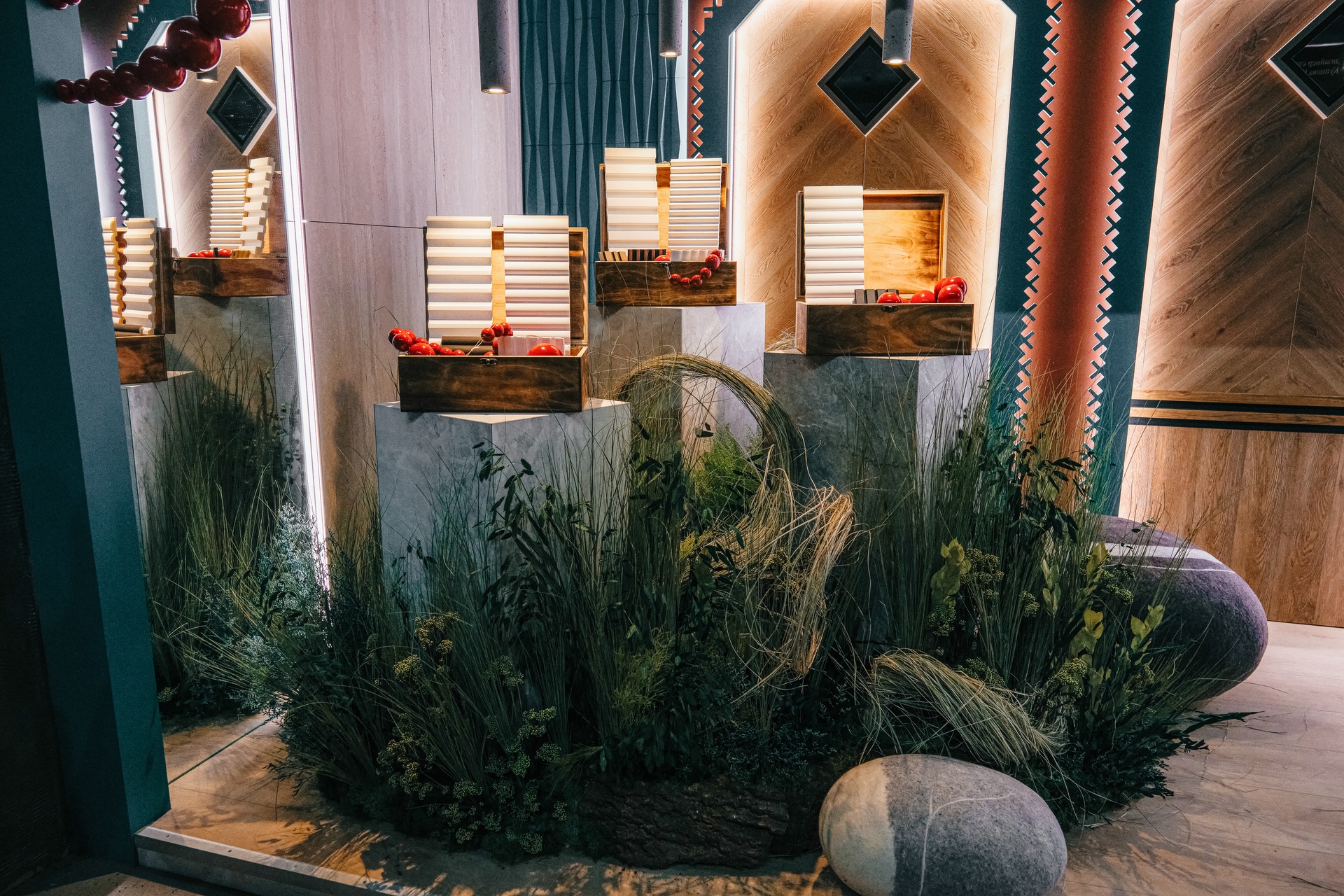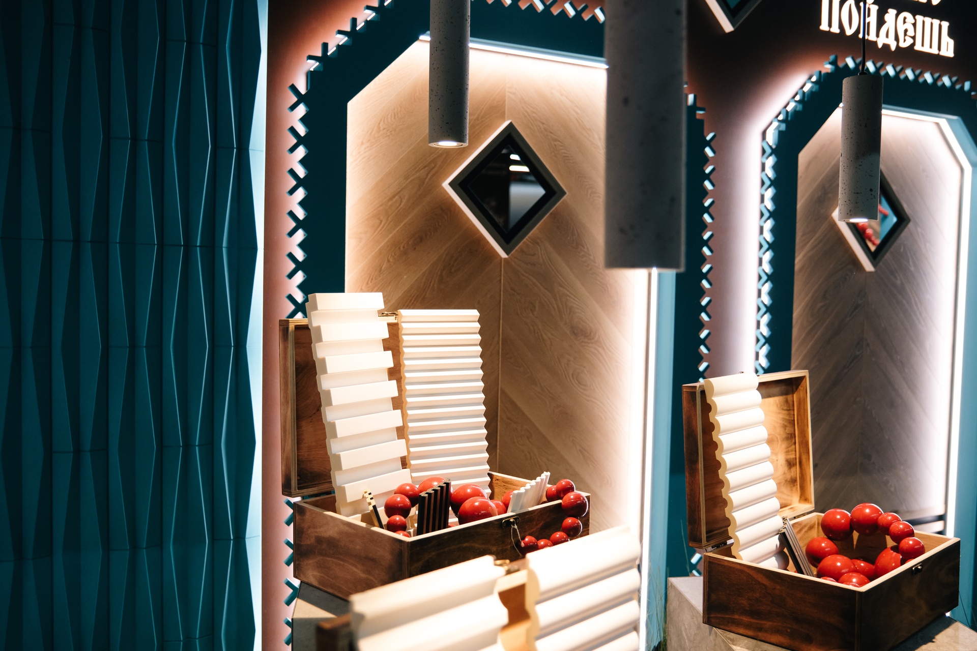 Ярким акцентом стенда стала презентация новинок бренда Alpine Walls – коллекция стеновых панелей Geometrium, образцы которой были расположены в фотозоне и украшали стены выставочного пространства.